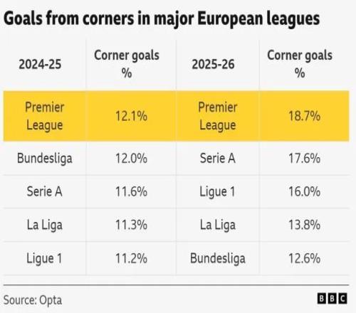 这个趋势不仅存在于英超,五大联赛的角球破门占比都比前一赛季有了提高。英超是从12.1%提升为18.7%,意甲和法甲也有类似的明显涨幅,西甲和德甲的涨幅则低出不少(下表)。