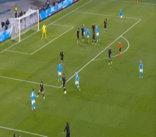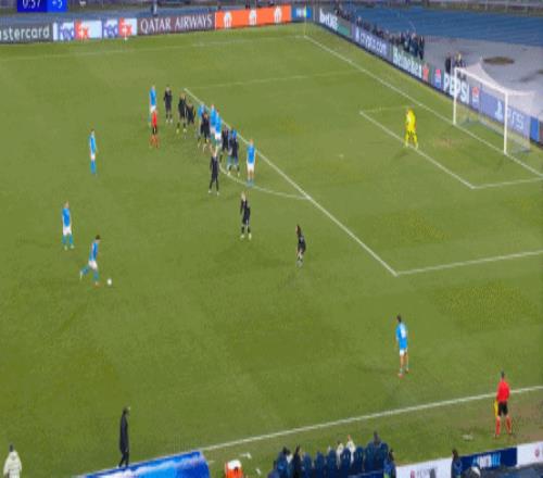 但在这次任意球的主罚过程中,那不勒斯送上了手球犯规,于是任意球直接变成了点球: